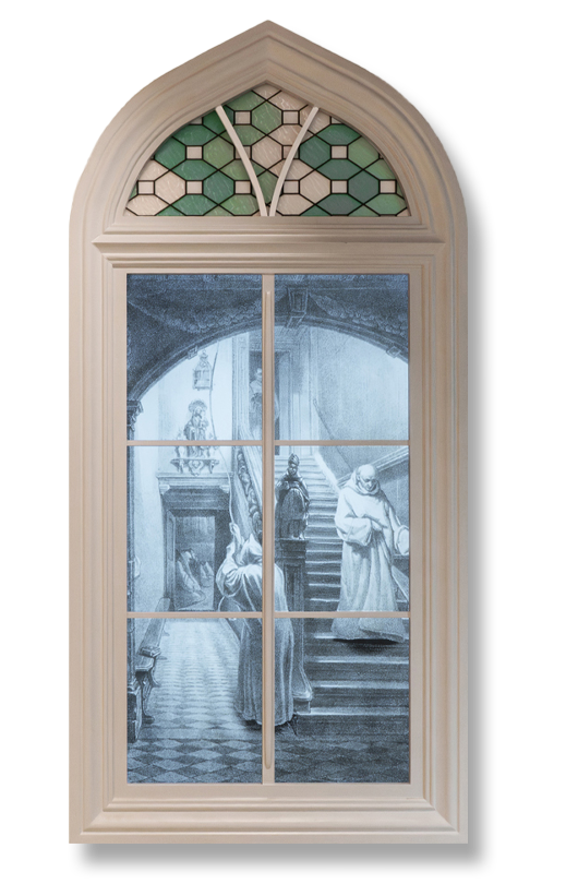 Vensters naar Vroeger neemt je mee op een tijdreis door de geschiedenis van deze bijzondere plek. Verspreid in de oude kloostergang bevinden zich vier ramen. Wie door de ramen kijkt, kijkt niet naar buiten, maar rechtstreeks naar het verleden.